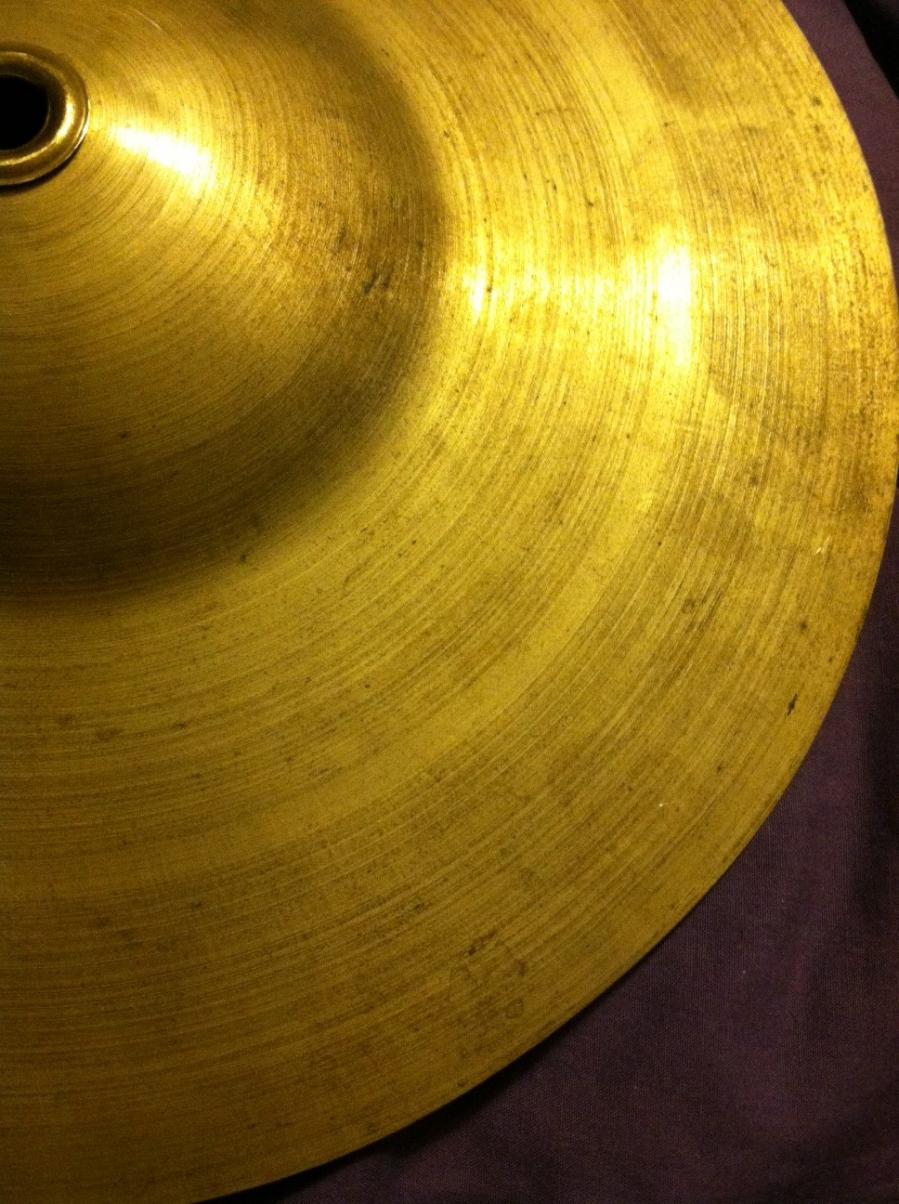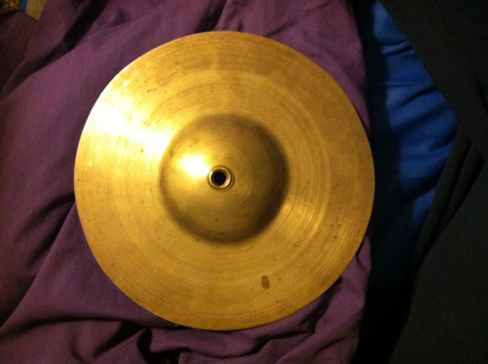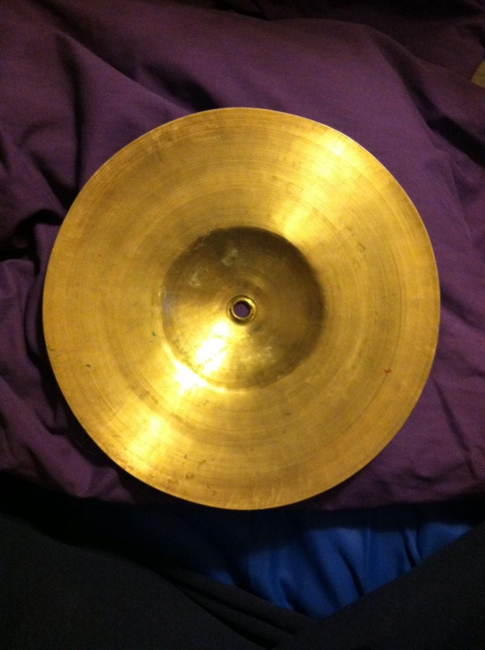 10" diameter, weighs 330 grams. Has the metal reinforcement around center hole. Could be a sock hat or old splash? Maybe a band cymbal??