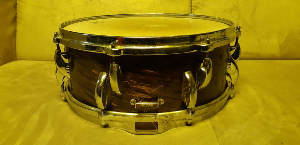 Vintage Beverley - made by Premier at their Leicester factory.A lovely drum, that!This looks like a 1960s snare - probably 3 ply birch shell with re rings (maybe a Deluxe / Super Deluxe? though these usually come up with flanged hoops). Mahogany Duroplastic wrap, similar 'slanted' pattern to Ringo's early Premiers. Should have had a round badge, though I think the earlier badges might have been rectangular and maybe had cast hoops?I've had a good few Beverley drums over the years, including my very first snare (a 70's steel shell), and I still have a Cosmic 21 (lovely Supra copy), but I'm not an expert!Beverley was a previously independent English drum-maker, taken over by Premier in 1958, and then later by B&H.