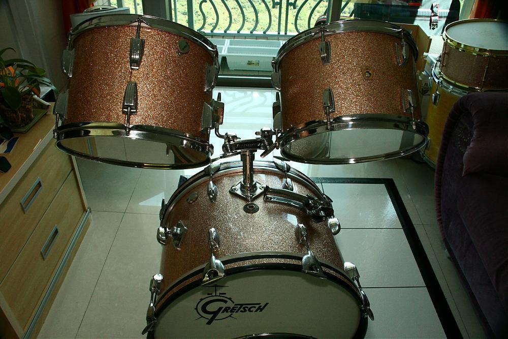 Ludwig toms from 1966 and 69: 12" tom in copper sparkle (1966), 13" tom in copper sparkle (1969), 14" floor tom in silver sparkle (1966).