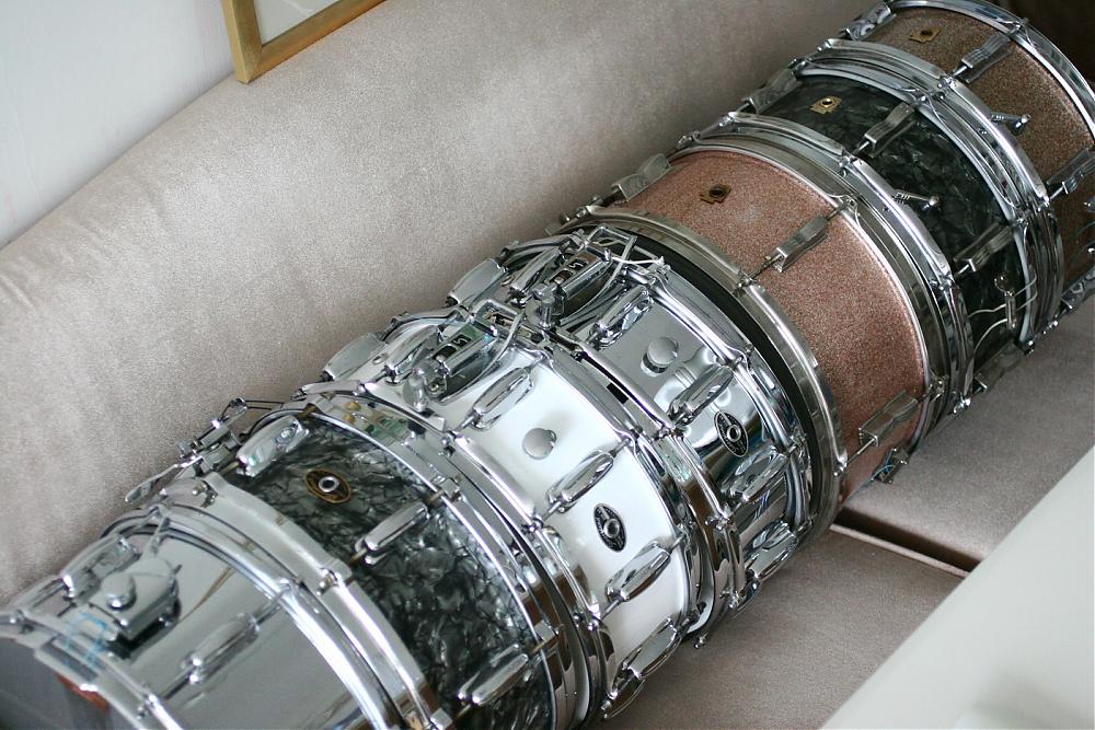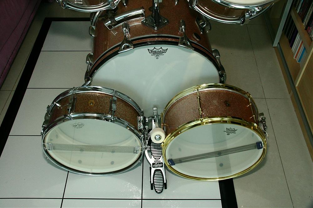 The snare is a WFL from the late 50s. It's a 6.5" x 14" 3-ply mahagony with maple re-rings.