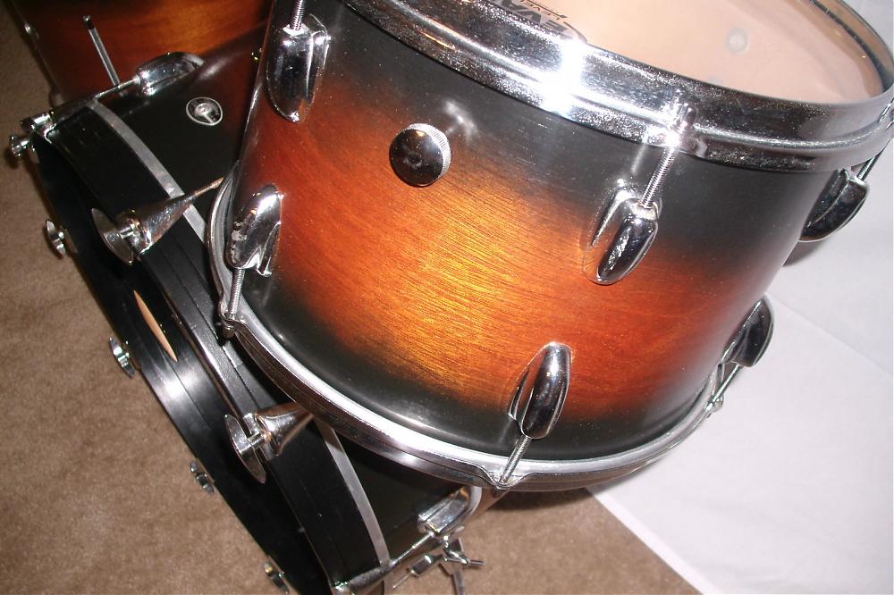 That looks like a do-it-yourself fade finish to me as well. The transition from dark to light would have been more smooth and certainly more linear. Also, wood finishes in this time period were generally finished as hi-gloss lacquer and occasionally an oil finish. Matte finishes are a fairly new trend. Drums appear to be in pretty good shape otherwise, but I agree that it is overpriced.