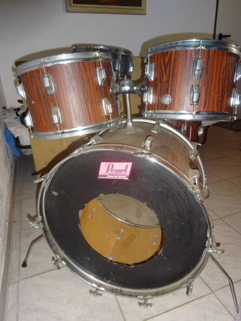 This appears to be a Pearl kit from the 70's, with Swivo tom legs and bass drum brackets. The tom holder is a 70's Slingerland Setomatic. The shells may be fiberlass! Not sure if the wrap is original, due to the vertical grain pattern. Pearl did offer a finish like this, but with a horizontal grain pattern. Really need to see the kit up close and personal to make a determination!
