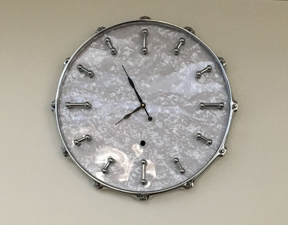 It's made from a 14" 12-lug 2.3mm hoop, tension rods, chrome-plated brass tube lugs, White Marine Pearl and a clock mechanism.