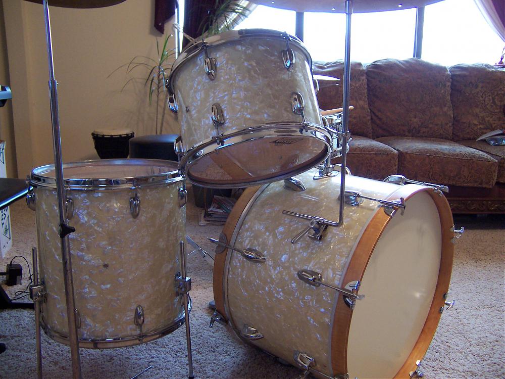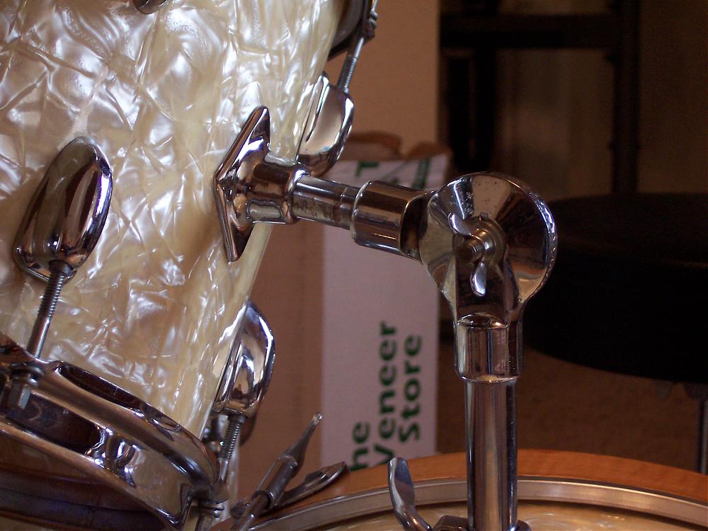 A friend of a friend heard that I am into vintage drums so asked if I could restore a set he has, or at least get them up and running. I think I have parts for everything, except the front 8 bass drum T rods (they're larger than any others I have!). I have an old spur bracket that fits and I will make some spurs for it. I doubt he wants to spend the money on the proper tom mount (or cymbal mount for that matter), but if anyone has what this requires, let me know and I'll ask him! The bass also has some water damage and even mold in there.