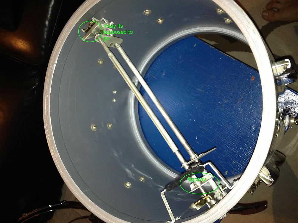 hello! I restore old vintage/ brand new snares/toms and make them custom snares detailed to whatever you like. I also restore vintage drums fully back to original like think John Grey Keltic marching drum, that i can fnd NOTHING ABOUT!! and my problem is to finish it up to be fully functional, im missing parts for the parallel top snare strainer, that actually holds to snarewires in place and bridges the gap properly between the top head and the strainers. (see photo #1)
