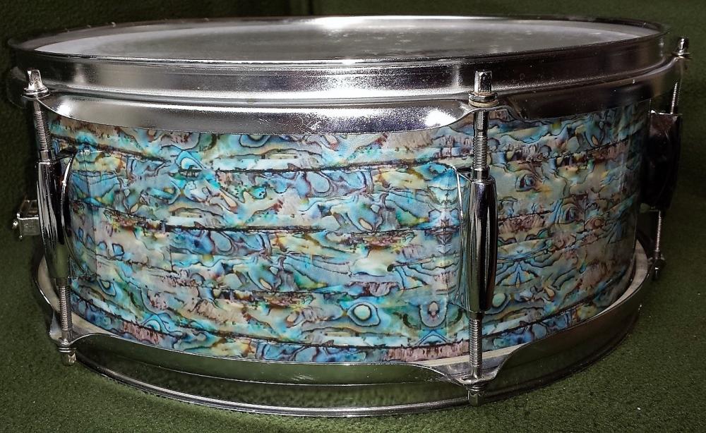 I just had to share some pics a customer sent of his snare wrapped in Walopus Caribbean Abalone.