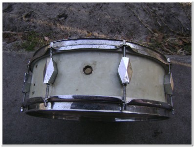 This,ladies and gentlemen is an example of the EXTREMELY rare and short-lived Kent "coffin" lug.I believe it was a bridge between the old standard lugs and the Japan era.A drummer in my high school rock ensemble had a set of these,a moire color,with W+A clip-style tom mounts.All I ever see of these is singles.A set of these would be the capstone of a Kent collection,for sure.These drums were American shells.