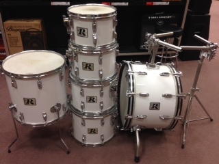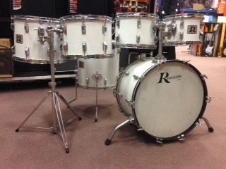 Rogers six piece in white wrap finish. I could not find any real blemishes and the hard ware is perfect. Everything works great and the drums came with the original heads on them. The shells are five ply with re-enforcing rings. These drums sound incredible. I love getting great deals.