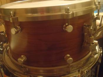 You are too kind Mr. D-, almost feel like I've hired a PR man that pays me! LOL! Here's a link to a few pics I took of her before she shipped. The other snare in the pics is for sale also, haven't listed it here because it's not vintage. Presently the only complete drum in stock, but will soon finish a 14x6.5 Stave Shell Bocote with brass hardware & Gibraltar Maple hoops (hybrid metal/wood top). Thought this was sold but buyer backed out. It is going to be a bit pricey due to the price of the parts & shell. The raw shell alone cost $179. Bocote ranks nearly twice that of American Rock Maple on the Janka scale coming in at 2,200. I have several 1-ply, steam bent shells in stock at present time including a 14x7 VC Maple which would be perfect replacement for a trashed out Radio King shell. Also have two other VC steam bent shells that are finished & awaiting hardware. One is a 14x5 Catalpa & the other is a 12x5 Cypress, both have hand-rubbed pure Tung Oil finishes that have taken more than a year to complete.