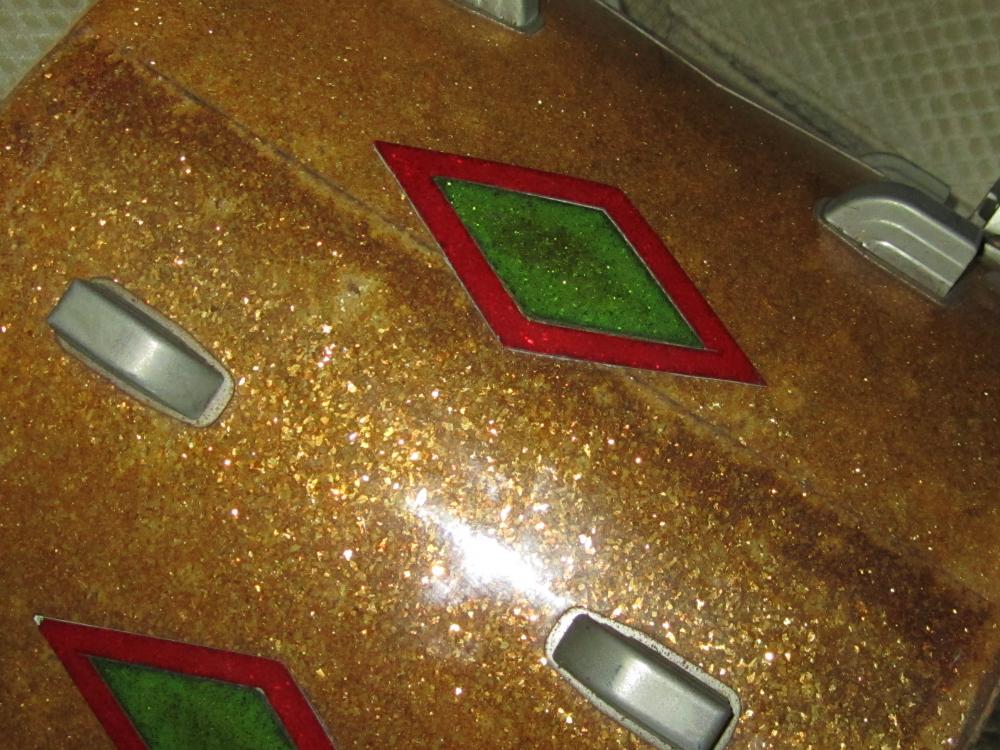 Anyone interested? I have no experience with Leedy or marching snares. The wrap is tight, shows hardly any wear or dings, and there are no signs of rust on the hardware. There are no extra holes or modifications. The green and red diamonds are clean and tight, the interior clean and the re-rings are nice and firm. The hardware seems to be all nickel with only the wooden hoop showing signs of use, but not abuse. This was a dumpster save, and unfortunately, no other missing parts could be found. So be aware, this offer is for the shell, one wooden hoop and the t-rod style lugs to hold the hoop to the snare. The wooden hoop is black with red sparkle in-lay.Could not find any solid references to what the value of this drum might be-so as a shot in the dark, I'm asking $150 plus shipping from southeastern PA. PM me if you want additional pics additional info or want to make an offer. Dean
