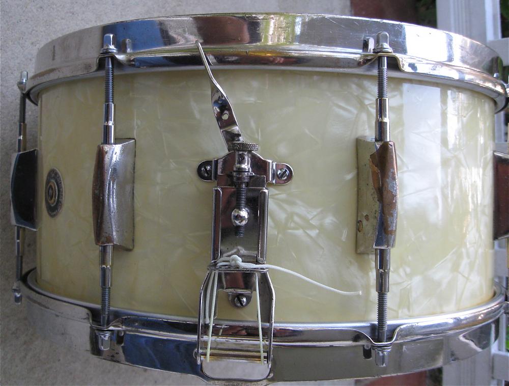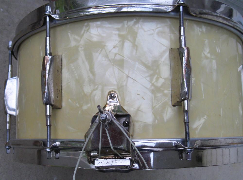 --all hardware & hoops are original except for a Leedy 3-point strainer that replaced the Dual Plane throwoff, leaving three small extra holes hidden under the strainer assembly (not sure if snare wires are original)