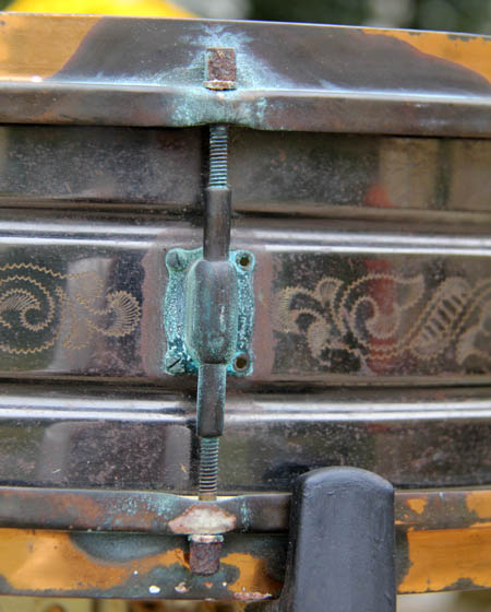 As you can see, there is a lot of discoloration of the lugs, rods, rims, strainer, and butt. Can anyone tell from these pix if that's just the Nobby Gold lacquer wearing off? The fourth picture is of the worst lug. I'll post pix of the rim and heads in a following post and some questions of lesser importance.
