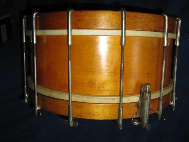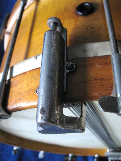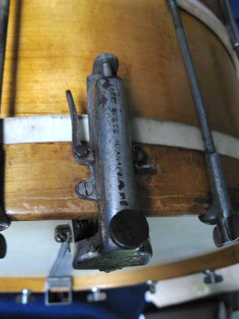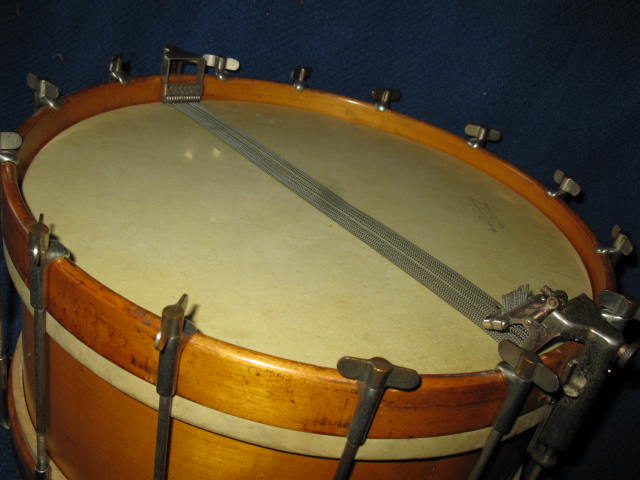 Leedy 6X14" snare, Top of the line 14 single tension rods. "Ideal Combination Snare Strainer & Muffler". The main selling points of this snare was that the snare wires always maintained their tension, & simply moved up & down against the head. The strainer system was also attached to the hoops, which was touted as aiding the changing of heads.