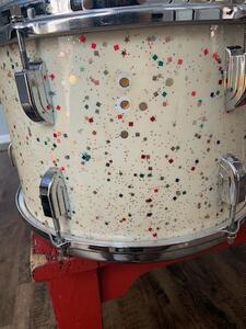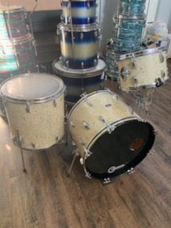 Here's a1965 Leedy kit in a very rare fiesta pearl finish. The drums are in great condition. There are minor cracks on floor and kick. It's missing muffles and rail mount.