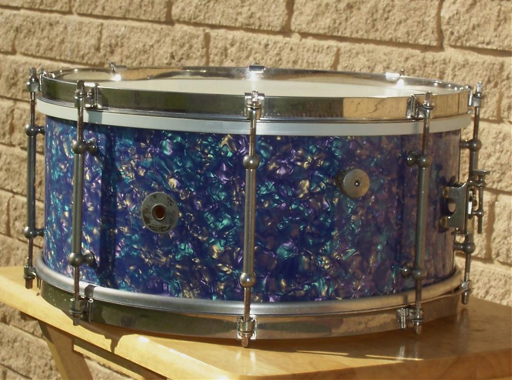 While working several other projects I happened to notice a Mediterranean Pearl wrap being offered by The Precision Drum Company. It reminded me somewhat of Ludwig's vintage Peacock Pearl wrap. I thought this particular drum might be a nice candidate for this particular wrap. In my opinion, these types of wraps seem to show better on shells featuring tube lugs.