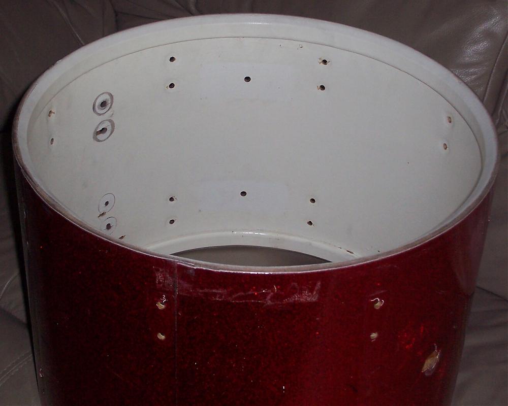 I've got a Luddy shell which is date-stamped Oct 2 1966 that I'm going to dump if no-one has an interest in grabbing it for cheap ($10 plus shipping?). I honestly don't know if it's worth considering since it's got extra holes in the shell and is also a bizarre size (12 x 17). All the hardware has been stripped from the shell as well as the keystone badge. A prior owner had installed some non-Ludwig FT leg mounts on it, creating extra holes in the shell, and it also has a couple extra holes for a couple of metal "rings" that were in the drum. It was originally drilled for the small Ludwig classic lugs. I've still got the original 17" metal hoops that were on it as well as the (non-original) legs and leg mounts, which I'd include if anyone wants them. Have a look at the pics and drop me a PM if you could use it. Thanks!