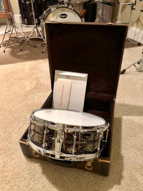 Ludwig 5x14 90th Anniversary Black Beauty. This drum is now 20 years old and has never been played or left the case. Only 90 of these John Aldridge engraved drums were made; this is 50/90. It includes the great leather plush lined case, all paperwork documentation, and a COA signed by WFL II.