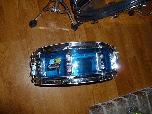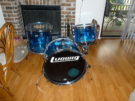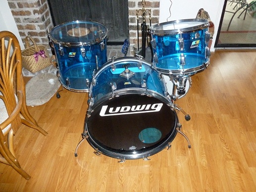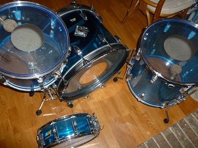 Here's a Ludwig blue vistalite kit I just aquired, there are a few minor scratches, but no cracks. As you can see in the pic they are real blue with no clouding and the hardware is very clean. It has metal hoops on the kick and new Ludwig clear silver dot heads all the way around, except for the snare.
