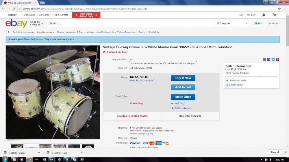 Wow! Not mine, but if anyone is near Poughkeepsie, NY and likes Ludwig Downbeats and Classic snare drums, this looks like a great deal at $1700. Super vintage looking wrap with that beautiful greenish tint.