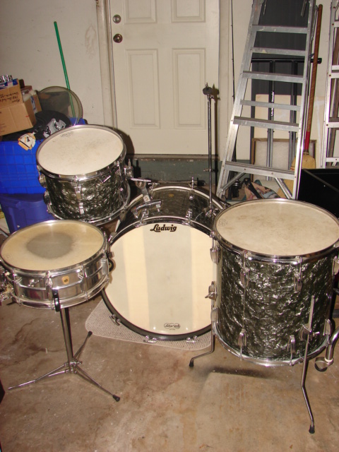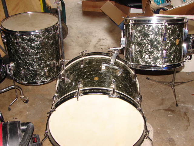 When I got my 1966 Ludwig's I put new heads on them. When I was replacing the bass drum heads I noticed a fabric strip stapled to the bearing edge. Although this did not affect the edge it did get me wondering if that was something that the original owner had done or if it was done at the factory on some models. It was probably the original guy mimicking someones felt strip and not knowing what he was doing but I thought I'd check with you Ludwig gurus and see if you have ever run across that before. It seemed absurd to me but guys do all kinds of crazy things to make their drums sound better. The pics show the drums the day I brought them home. They are now clean and with new heads but this is just to show the strips inside the kick.