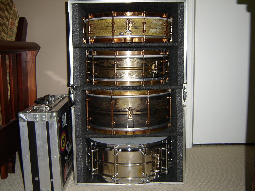 The top drum is a 4 X 15 Stipplegold (10 Lug) with Ludwig Chicago USA engraved on the top hoop. Next is a 5 X 14 Black Beauty (10 Lug) floral pattern. 3rd down is a 6 1/2 X 15 Black Beauty (8 Lug) scroll pattern and on the bottom is a 6 1/2 X 15 NOB (10 Lug) players drum with a P-85 and triple flanged hoops. I've collected these through the years and all sound beautiful, thanks and I'll post more of the collection later. Clay