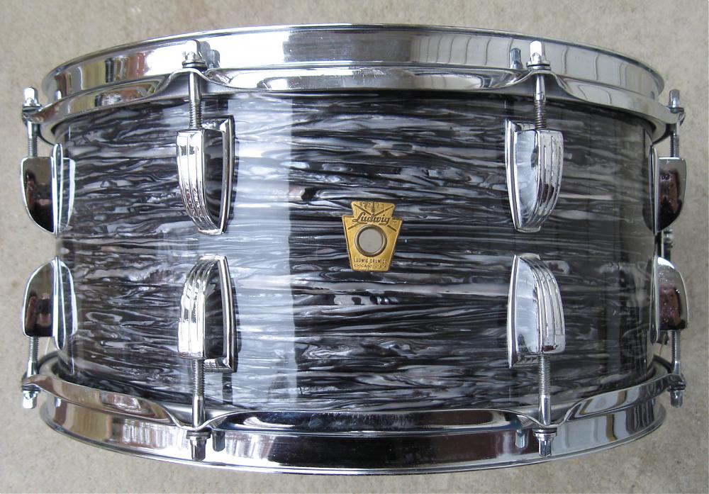 Ludwig 6.5x14 School Festival, Black Oyster Pearl rewrap, white interior. Keystone badge #572183 puts it at 1968 (no date stamp inside). **SOLD**