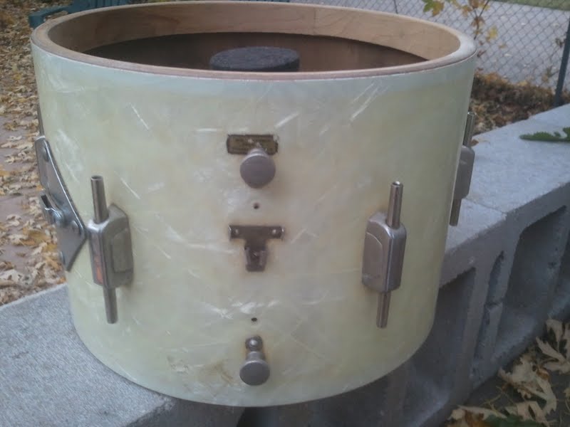 I have the 13" & 16" Toms. Both have their original top hoops with original tension rods and clips, as well as (2) mufflers per drum as well. The 13" is missing (2) clips & (2) tension rods. No bottom hoops or tension rods/clips for either drum. It also looks as if at some point someone added floor tom leg hardware, that is not original as it seems like this era used a cage stand to mount the floor tom.