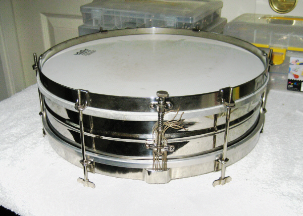 Since this picture was taken I have put on a Remo Fibersyn Powerstroke 3 batter head, Ambassador Renaissance snare head and Gilbralter snare wires. (I stored away the original snares so I can return it to original anytime.) The catalog describes this snare as "snappy"...WOW!...that's an understatement. Talk about CRACK!!...hit this thing firmly dead center and it almost causes physical pain.