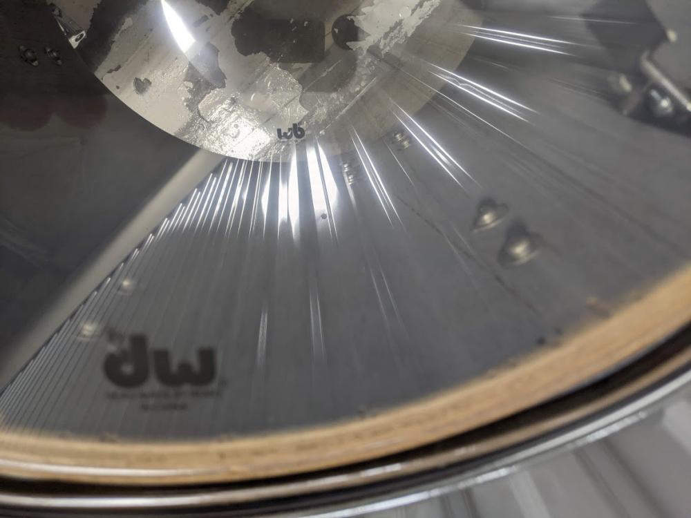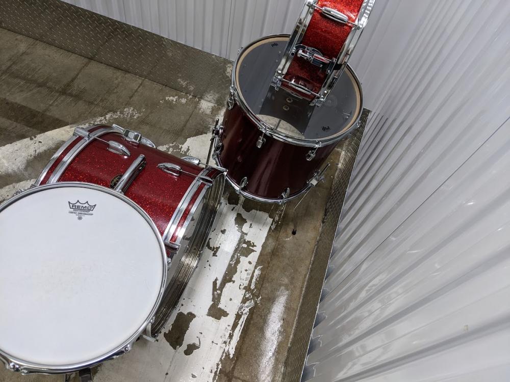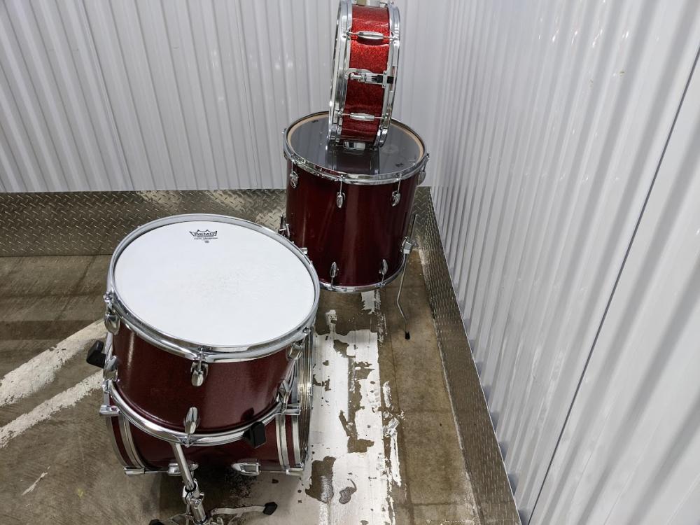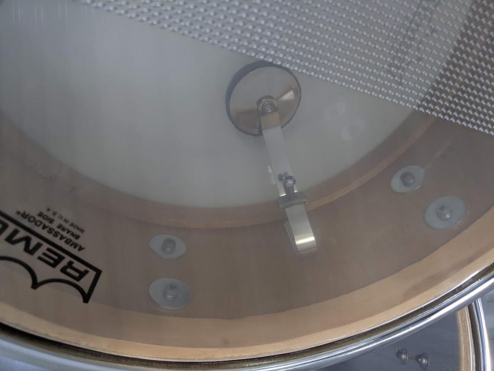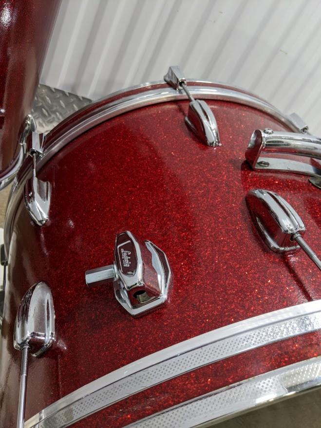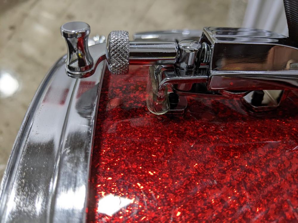 I took the tom bracket off and filled in the holes. I kept the tom on a snare stand (not included). The rail mount came on the bass drum. I left it on. The previous owner moved the rail over more towards the center of the shell, by using one existing hole. I filled in the other original rail mount hole. Cymbal bracket has been replaced with a Ludwig bracket. Holes lined up exactly, no drilling was necessary. Claw hooks are die cast; the originals were rusted and bent. The snare throw has been replaced, with the original holes filled in. Internal mufflers on the toms and snare.