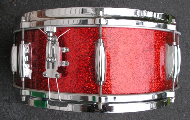 Red Sparkle finish, Microsensitive strainer, adjustable butt, 2-pad knob muffler. No keyholder (or hole for it), Responso snares. No label or stamp on the silver painted interior.