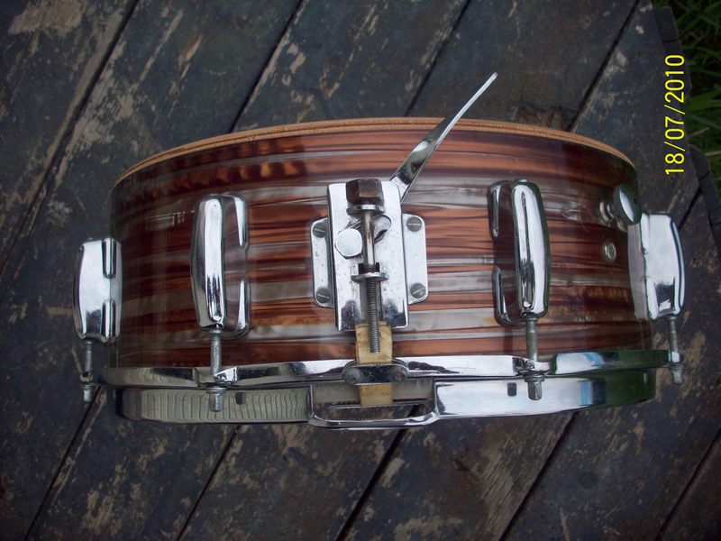 Would you let us in on how mucho dinero? This is just an amazing find. These early Stars are so rare and hard to get, let alone in desirable wraps. This is a oyster pearl wrap, I want to say ruby...? Is that likely what it could be? The reason I am certain it is Star is because of the snare and bass lugs, and the bass T-rods. That is one cool strainer as well. If you need to repair it, let me know. I think I have an exact replacement I can exchange. I'll look in my new pile.
