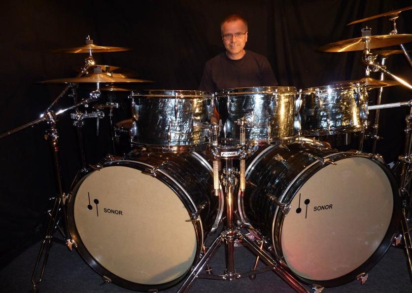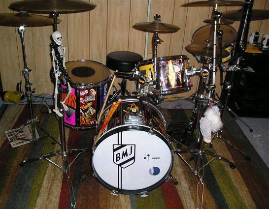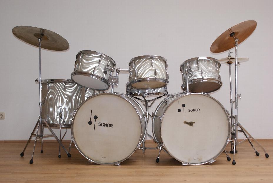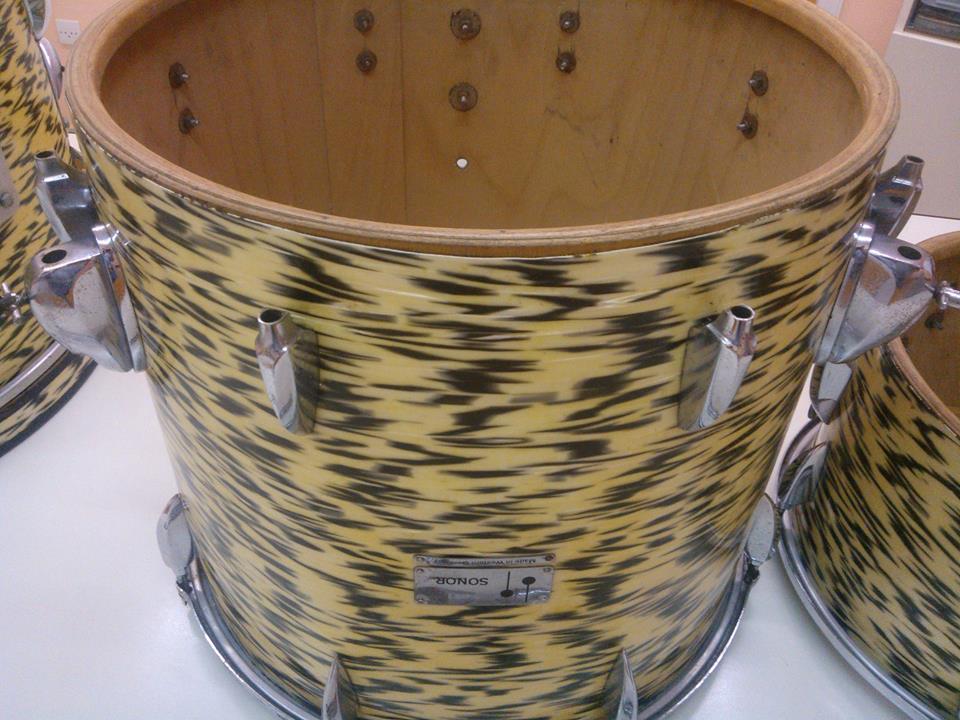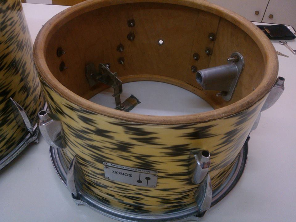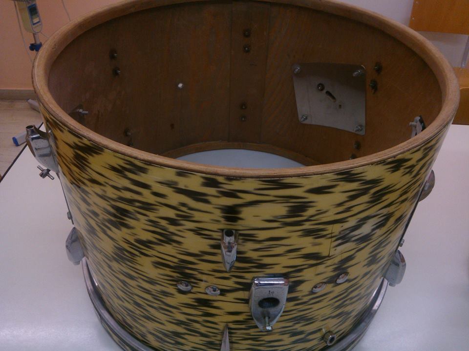 There's quite a few issues with this one, but I think I can make it sing again - eventually... The TT and FT are slightly out-of-round in the middle of the shell and they're both missing a hoop, someone has fitted metal reinforcing plates on the spur and cymbal mounts - both inside as well as outside the BD - so there are extra holes, a BD spur is missing and the other one is missing its ring (the one that goes above the rubber tip), a BD hoop and its T-rods are also gone, no badge on the BD... and a couple of other things I'm forgetting right now. The whole kit is dirty as hell (the BD especially) and feels oily to the touch, as if it's been sitting in a garage for 50 years. There's also some kind of sticky residue behind the lugs and under the hoops, right where the skins touch the bearing edge - no clue what that is... Oh, someone's spilled something on the TT and FT and there's some kind of mark left on the wrap at places, kinda like a burn mark that has healed - not readily visible, but it's there.