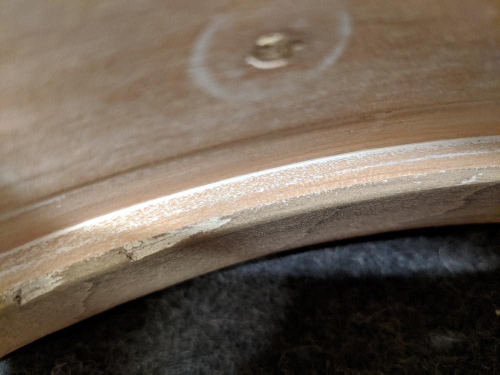 I have sanded the interior for re-painting because the interior was yellowed and stained from years of exposure to no resonance head in smoky clubs and bars. This is a player's drum that was nested, so these pics are from the batter side. The original owner said he purchased the kit in 1965 from a music store, but I suspect that the drum is from a number of years earlier. I don't trust my eyes, so here's how we play the game: