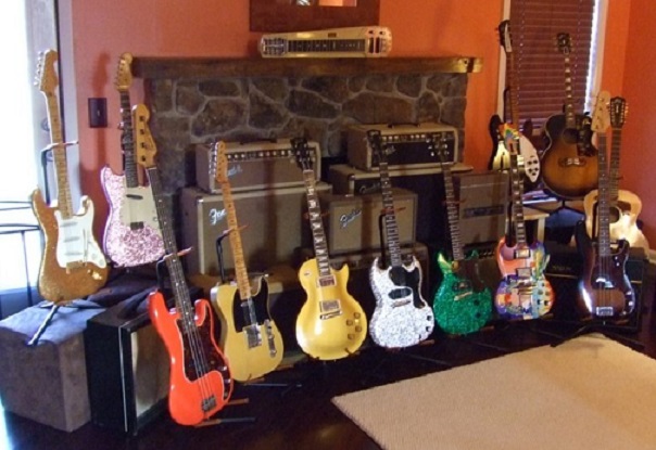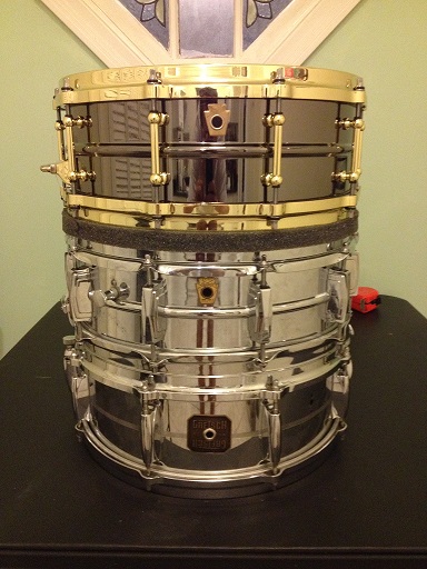 A few more pics. The snares top to bottom: 2013 Black Beauty, '69 supraphonic, 70's era COB Gretsch. The gretsch was originally sold with my dark brown kit. The champagne sparkle kit is a mid 60's slingerland. I also threw in a picture of me and the old mans guitar stash as it looked a couple of years ago. Behind it is a collection of fender brown face amps. I know its a drum forum but hey...