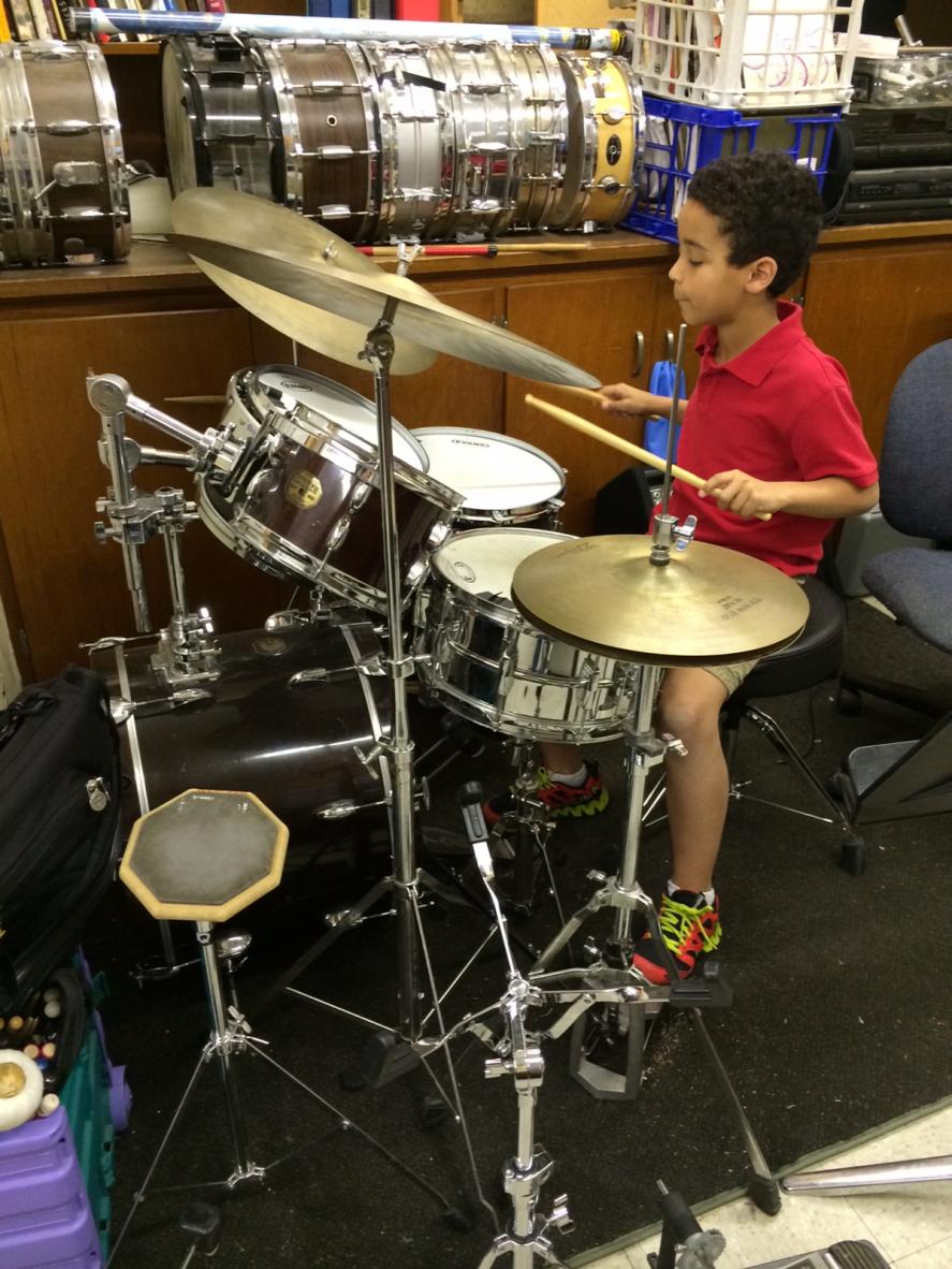 Great pic ! I teach drumset to alot of children this age and thank heavens he didn`t end up as a guitar player,lol.Hope he enjoys it and sticks(excuse the pun) with it. If the teacher makes it fun the learning is sure to follow.