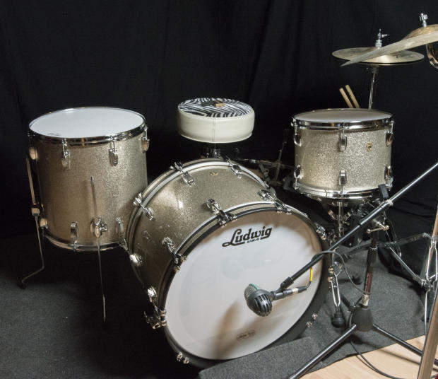 Downtown Farmer hooked me up with the cymbal mount holder and I had an L-Arm repro from my Gretsch 3-ply days. He also got a sample for the Vintage Nickel Sparkle wrap from Precision. Thanks buddy! Looks like it is the closest so far. Here are some pics of the Vintage Nickel Sparkle sample against the drums. My (already) re-wrapped 1955 WFL Ray Mckinley is crying out for a close to matching wrap. Lemme know what you think guys!