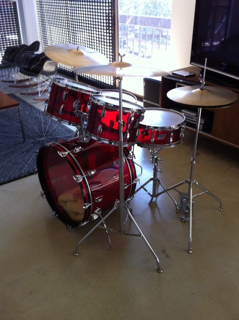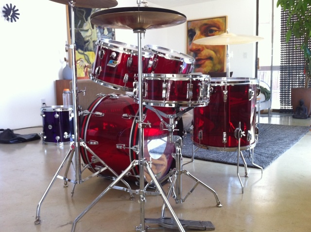 This is awesome. I have the same kit, but blue in color. Same hardwares and whatnot. I think the cymbals are also 70's Zildjian cuz they don't have any logis printed on them. Sadly, when I found mine in the garage, one of the bass hoop was missing, along with the T-bars and claws. Anyways, I like the blood red color of your kit. ;)