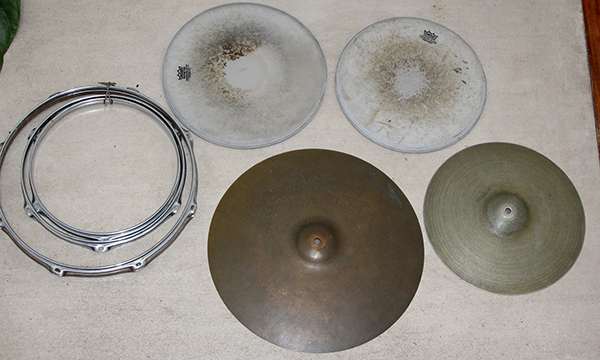 The right cymbal is a 14" Paiste 101 hihat (bottom), nickel silver I suppose.