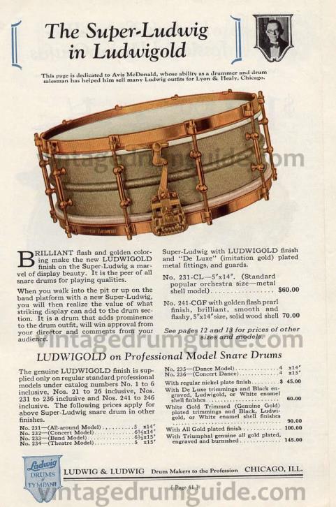 Ludwigold is the name for the textured irridescent gold finish gold finish that was applied to both metal and wood shell drums in 1926 through the early 1930's. "DeLuxe" was the term used by Ludwig & Ludwig for their imitation gold lacquer that was applied to hardware.