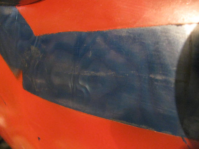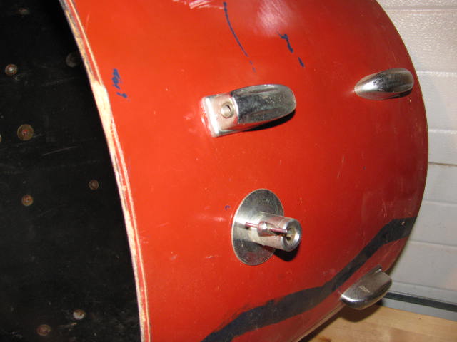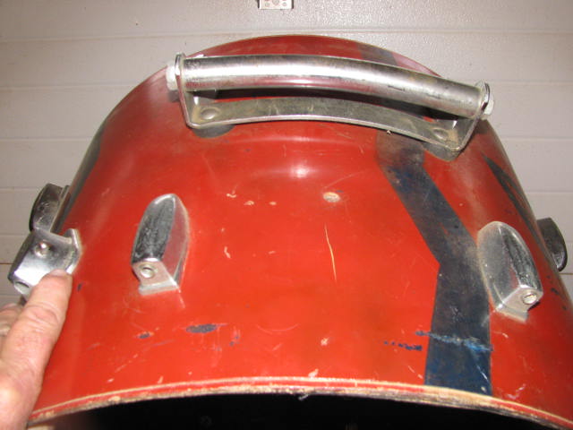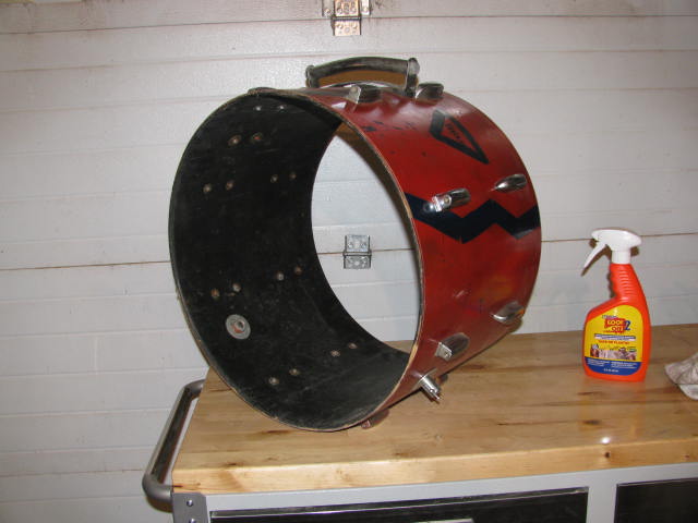 This 20" bass drum shell came with a 1969 luddy standard 5 piece I got at a garage sale a few weeks ago. The guy said its Slingerland. Someone painted it red and taped off some squiggly stripes, and you can see the original finish on the stripes. It has no badge and one crack in the wrap on the very top. The interior is black.