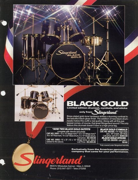 Yes, Slingerland's 1982 - 1984 Black Gold Series. Spirit 3-ply shells and hardware, Black Gloss with brass-plated hardware. Brass-plated steel wrap over wood snare drum, matching hardware, cymbals and sticks. Interiors either charcoal or clear. If you tell us the first few digits of your serial numbers we might be able to pin the date down further. Flyer below.