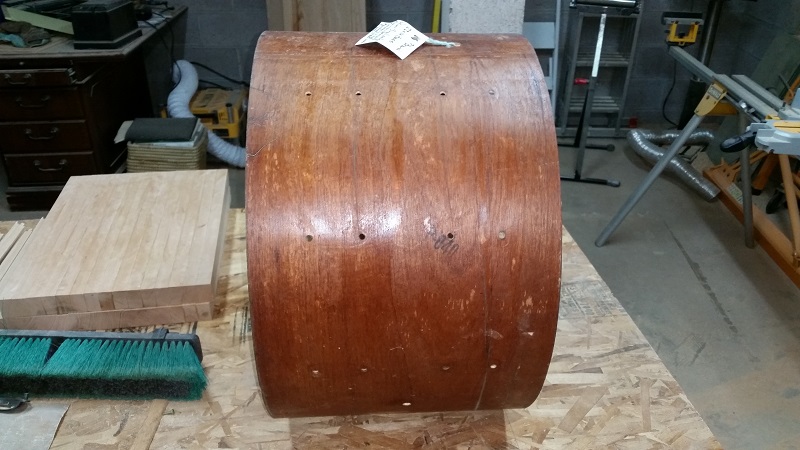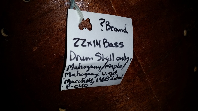 So I recently visited a drum yard sale and found this barren bass drum shell, 22" x 14" with holes for 10 lugs per side, and bass drum spurs. No holes for mounting hardware nor any holes for a cymbal attachment. Dated inside the shells March 14th, 1968. The shell is a three ply shell which looks like mahogany, maple, mahogany with maple reinforcement rings.