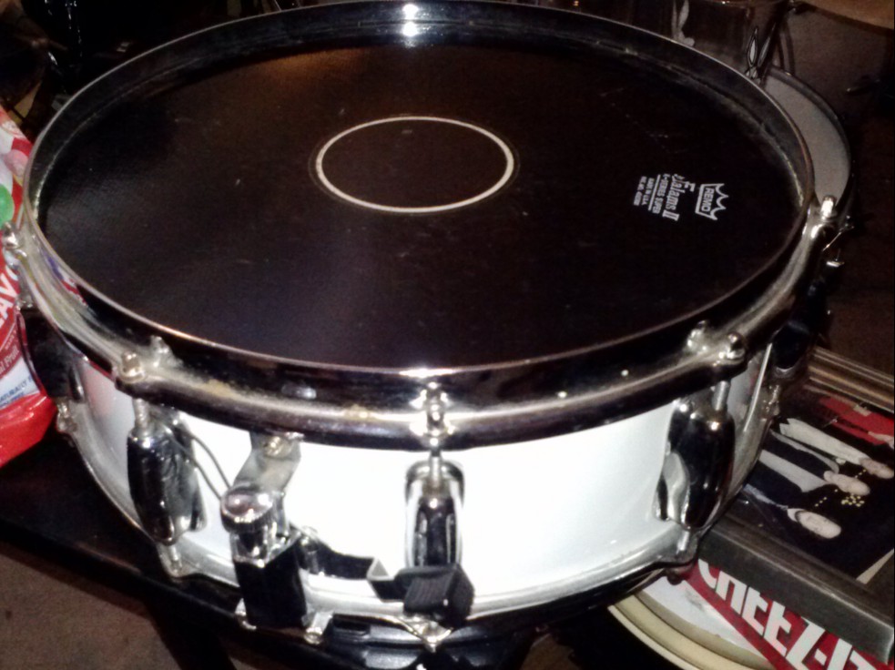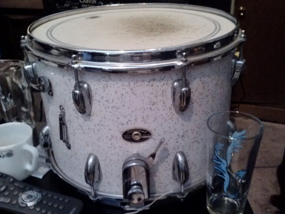 It came with 2 snares. The first is a 14x8 maple one which matches the set. It's quite an unusual one with 16 lugs, and has a deep sound. I really like it. The second is a 10 lug 5.5x14 aluminum snare from around 1974. That guy's been really tweaked to the previous owner's liking. It has a white wrap, a Rhythmtech active snare system and a black Remo Falams II batter head. It seems like a nice snare, and I enjoy using it for things like CCR, etc. It's punchy and projects well.