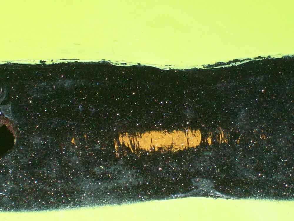 I just did a bit of an archaeological dig on the paint, and was a little surprised by what I found. I took an Exacto knife and started shaving off thin layers of paint. From the top layer down, here's what I've got: