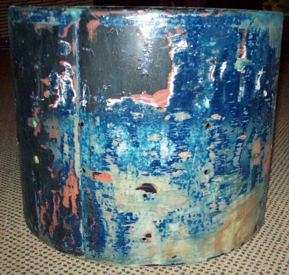 Good point. I just checked, and no remnants, so apparently it was originally painted. I just did a bit of an archaeological dig on the paint, and was a little surprised by what I found. I took an Exacto knife and started shaving off thin layers of paint. From the top layer down, here's what I've got:[COLOR="YellowGreen"]Lime green[/COLOR][COLOR="Black"]black sparkle[/COLOR][COLOR="DarkRed"]red[/COLOR][COLOR="Silver"]white or silver[/COLOR][COLOR="Black"]black[/COLOR][COLOR="Sienna"]flat gray-ish brown[/COLOR][COLOR="SandyBrown"]wood[/COLOR]That's 6 layers of paint!I tried this excavation process in the center section of the shell and also near the edges, thinking that if it was a typical duco finish, there might also be a layer of gold paint around the middle. But as far as I can tell, that's not the case - it appears to be the same 6 layers on the whole shell. And as far as I can tell from the catalogs on this site, none of those layers match a complete original catalog finish. So this is a bit of a mystery drum, to me anyway.I'm in the middle of stripping the paint right now with 3M Safest Stripper, so I guess I'll know soon if there are any more surprises/clues.Scott