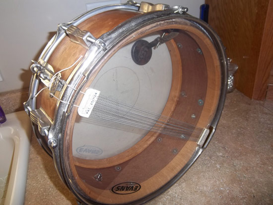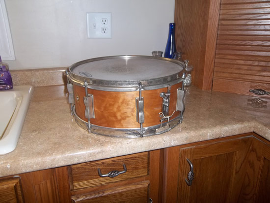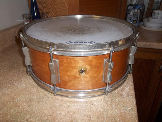The badge is a 60s Keystone (what I had available), installed with a removable grommet. The snare side head is a new Evans, and the batter head a used Evans.