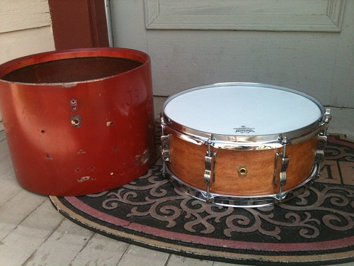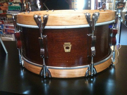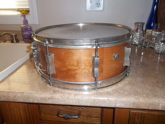 As before, this one started out as a 1959 WFL 10x14 marching snare, which I cut down to 5.5x14 and reinstalled the top reinforcement ring and then recut the new outer edge. It's original gold sparkle wrap was replaced with a natural cherry wood veneer. Most of the parts are nickel plated and original to the drum (exceptions: a chrome WFL P-83 and a chrome block logo snare butt). The hardware's a little rough, but not too bad.