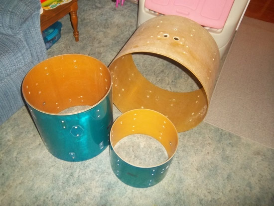 OK, just in the process of finishing up on the details for my next custom repro set made from 70s Pearl fiberglass shells. I've started prepping the shells this morning, and thought I'd better get some "before" pics. Yes, that picture was taken in our living room where I do work sometimes. And, yes, the Encore Western channel is what I'm watching... :)