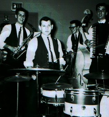 My first real drum set was a mid-fifties Gretsch Duco lacquer three piece outfit painted at the factory in Cameo Coral and Charcoal Metallic. This was the perfect polka drum set that Mom and Dad bought second-hand from one of my school mates. Here are pictures of my first paying gig in 1960 and representations of the colors of these drums. I'm still thinking of having some wrap made by Bum Wraps to dress up some orphan drums. I had never played a drum set before getting this set-only individual drums in school band and orchestra. As a profoundly left-handed kid. I thought that I should set them up lefty style. As you can see, I was playing with lefty feet and righty hands. Shortly after this first gig, I set them up in a traditional righty configuration, and played open-handed with a ride cymbal on each side. I still play that way with rides and crashes on both sides.