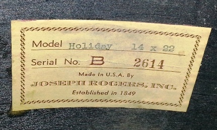 14 x 22 Black Diamond Pearl Bass Drum w/Eagle Badge and 16 separate tension early style Bread and Butter Lugs, Swiv-o-matic spurs, Joseph Rogers, Inc. label with Model: Holiday and S/N - B 2614, black interior paint, solid wooden hoops (no inlay), no cracks in the wrap, shell wood is 3-ply (maple/mahogany/maple) with large re-rings. I'm guessing mid-50's.